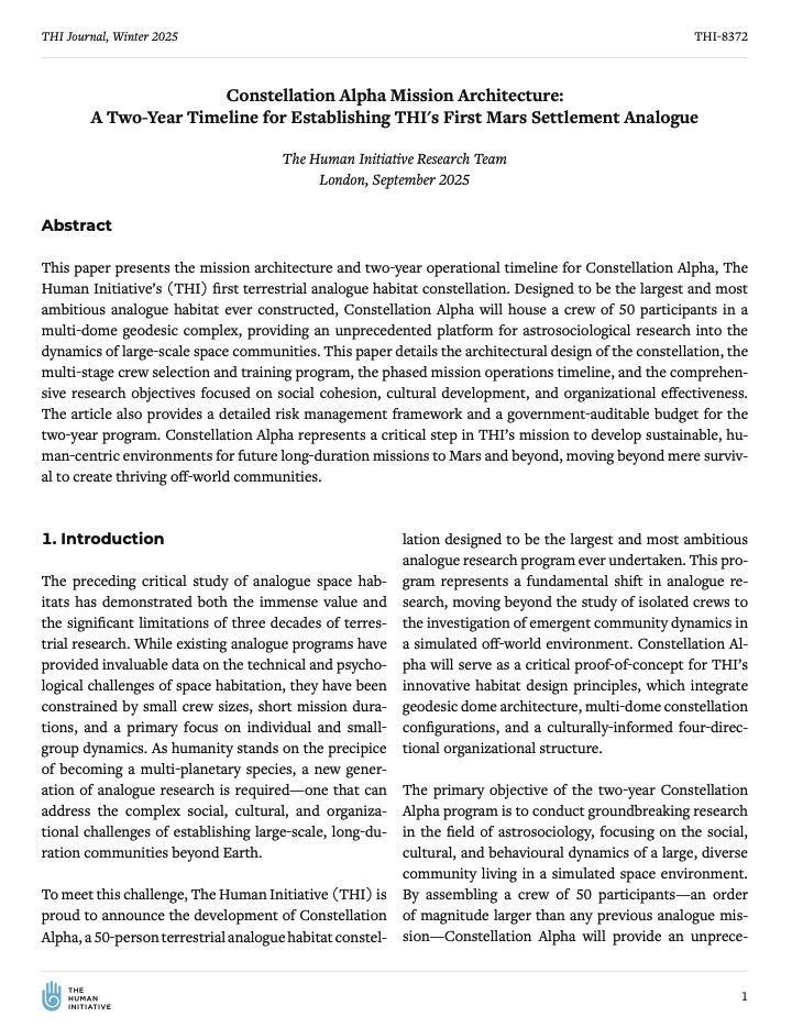 Our first mission, Constellation Alpha, brings together 50 participants in a geodesic, multi-dome habitat—the largest and most ambitious analogue ever built. The programme will study how communities form, govern, and evolve when removed from Earth’s familiar structures, pioneering the field of astrosociology and helping design the human systems that will sustain life in the uncertain years ahead.